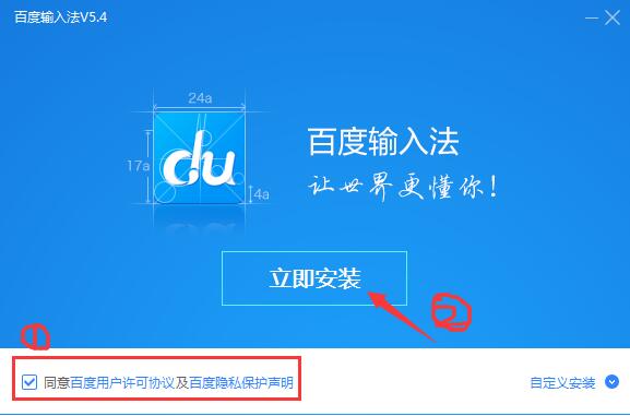 2、双击打开,我们就可以看到安装向导了,我们先点击右下方百度用户许可协议和百度隐私保护声明仔细阅读,阅读完后勾选同意协议就可以了。然后点击“立即安装”就能快速安装百度输入法软件了。