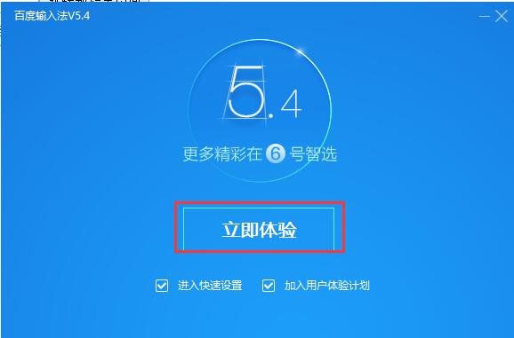 6、安装完成,点击“立即体验”就可以使用电脑版百度输入法了。这里还有两个附加选项“进入快速设置”和“加入用户体验计划”,默认是勾选,大家可根据自己的需求进行选择。