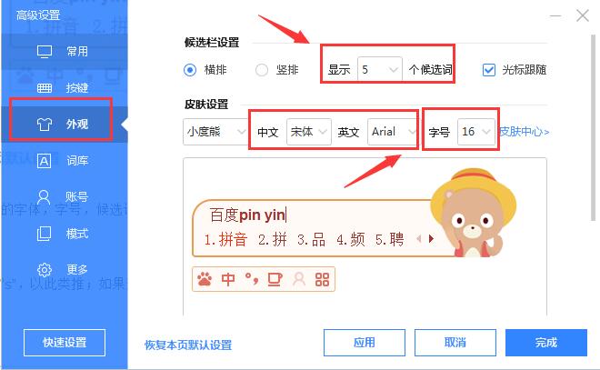 6、这里还有一个小技巧,在外观面板中除了可以设置百度输入法的皮肤外,还可以修改它的字体,字号,候选词等等。设置自己个性的输入法就在这里修改吧。