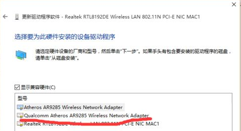 6、选择第二项“qualcomm atheros ar9285”,如下图所示。