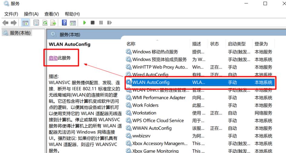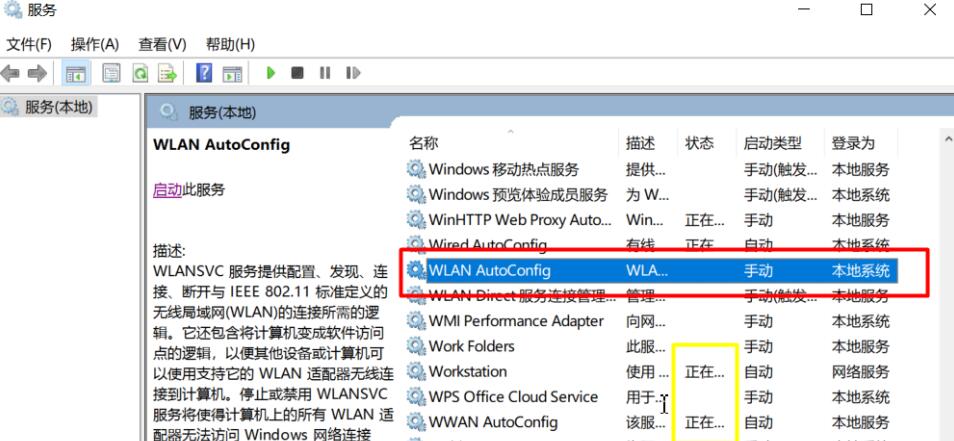 2、然后回车确定,找到WLAN AutoConfig项,看其状态,我这里的状态就不是正在运行,所以导致WiFi列表不显示,对比其他的正在运行的程序,状态指就少了‘正在运行’的显示或者显示正在运行也还是不显示WiFi列表,如下图所示。