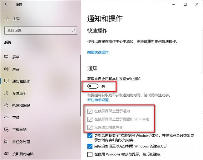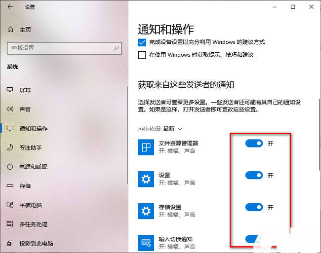 4、最后找到右侧中的“获取来自应用和其他发送者的通知”,将其开关按钮打开,那么下方的通知选项就会自动取消勾选,如下图所示。