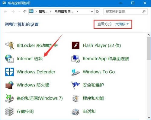 2、在控制面板中,将查看方式修改为“大图标”,然后在下面点击打开【internet选项】,如下图所示。