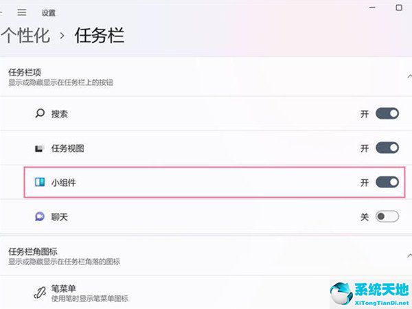 第三步,鼠标点击打开以后,找到任务栏板块下的小组件功能,关闭右侧开关按钮即可