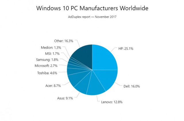 值得一提的是,“秋季创作者更新”的采用速度比“创作者更新”的采用速度更快,因为在发布一个半月之后,“创作者更新”份额仅为18.1%。正如所料,微软第一方设备采用率最高,达到45.4%。戴尔,惠普,联想,华硕和宏碁等大部分主要厂商的采用率都是平均水平。